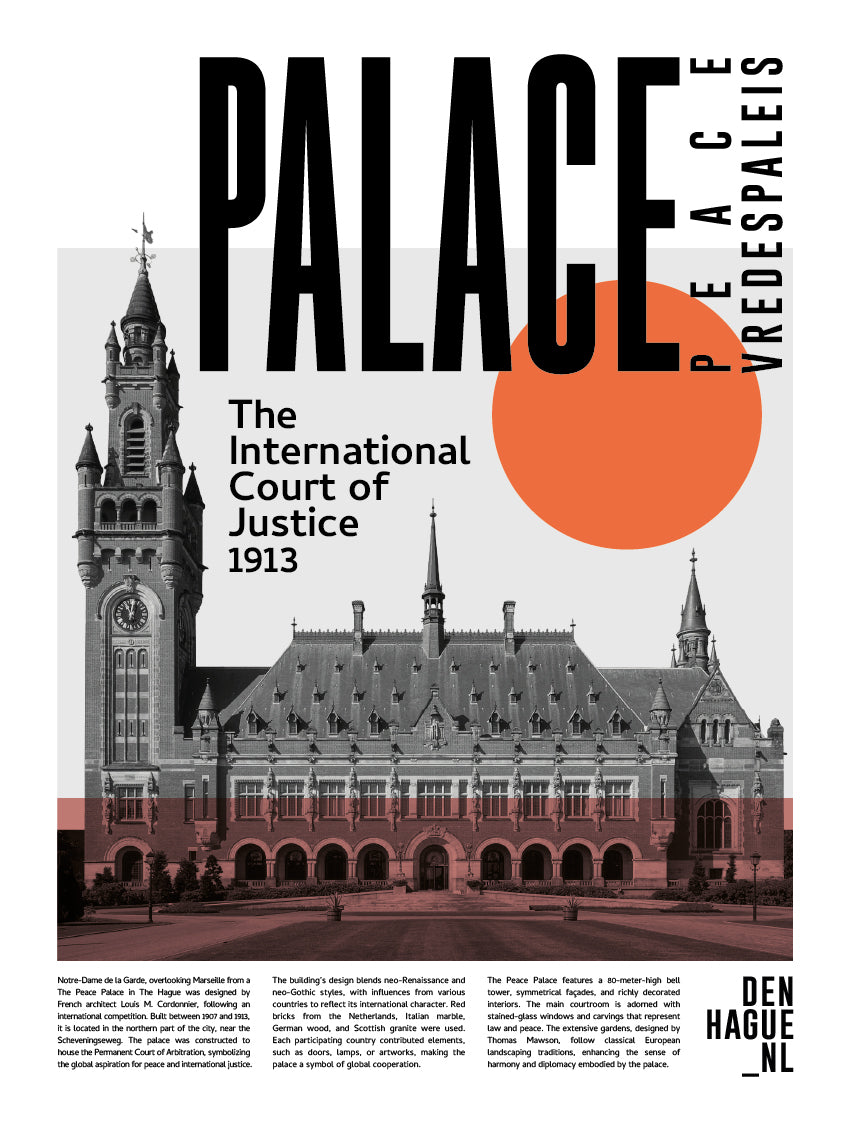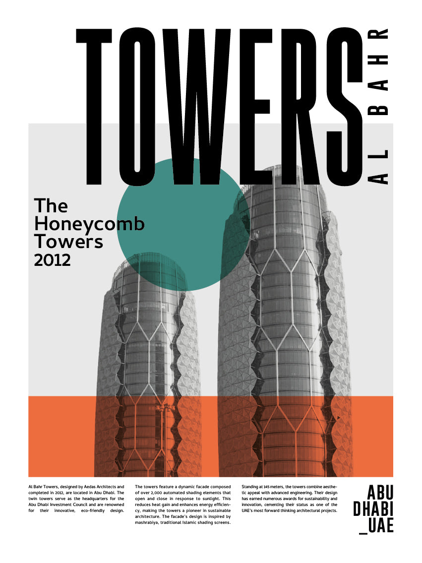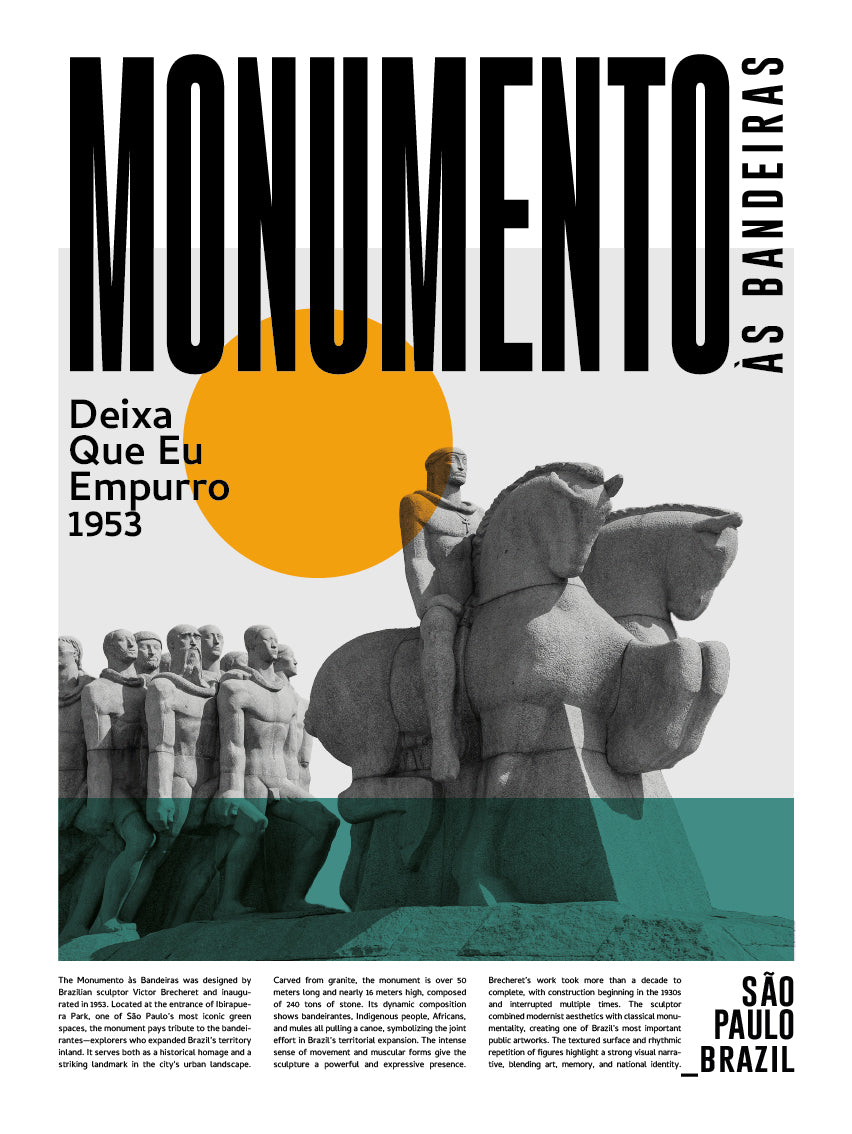 Each piece features a bold, graphic collage style with photography, colors, shapes, typography, and text elements highlighting the architectural and design history of the building or monument.