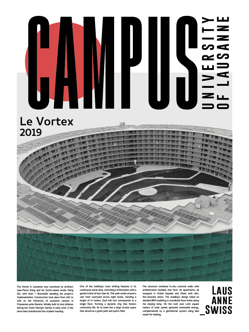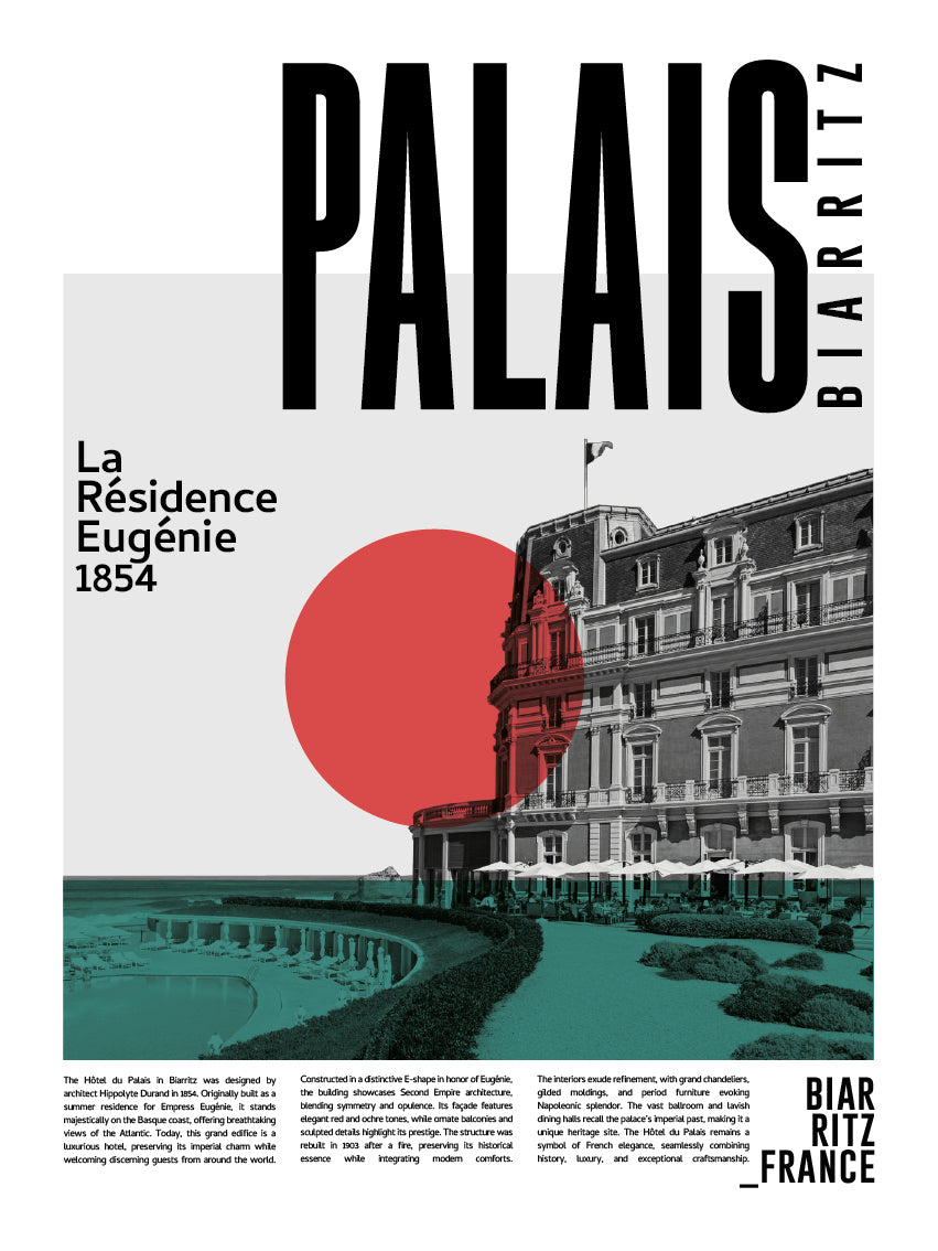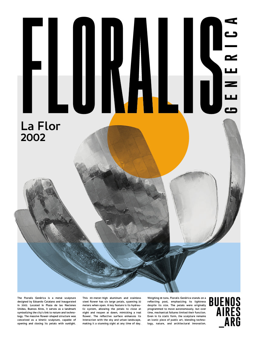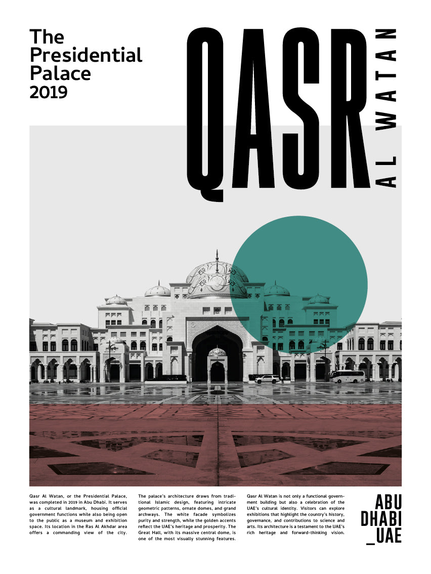 Each piece features a bold, graphic collage style with photography, colors, shapes, typography, and text elements highlighting the architectural and design history of the building or monument.